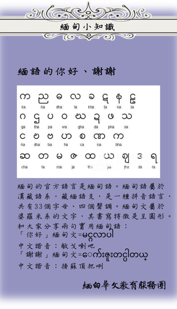 緬甸語是拼音語言,共有33個字母、四個聲調。